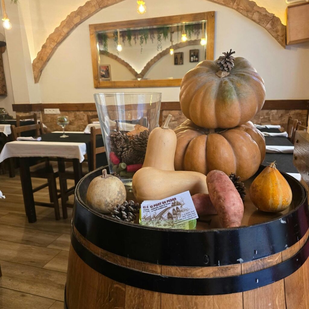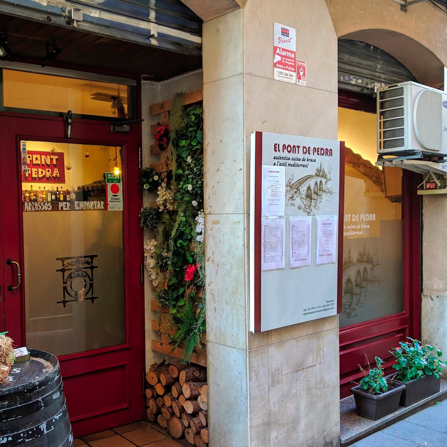 El Pont de Pedra ocupa una bóveda de piedra vista que invita a la sobremesa tranquila tras un día de compras en La Riera o una visita a la basílica de Santa Maria, situadas a dos minutos a pie. Su emplazamiento céntrico se complementa con un servicio ágil y amable que potencia la sensación de “casa”.